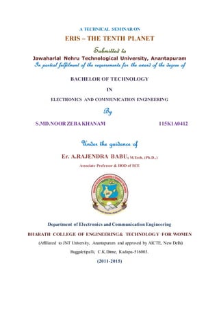The document discusses the discovery of the dwarf planet Eris. In 2003, astronomers Mike Brown, Chad Trujillo, and David Rabinowitz discovered an object they initially called 2003 UB313 that was later named Eris. Eris is over 25% more massive than Pluto and orbits further from the sun. Its discovery reignited the debate around what defines a planet. In 2006, the International Astronomical Union officially designated Eris as a dwarf planet along with Pluto, defining a planet as clearing its orbit. Eris' moon was named Dysnomia, the goddess of lawlessness in Greek mythology.