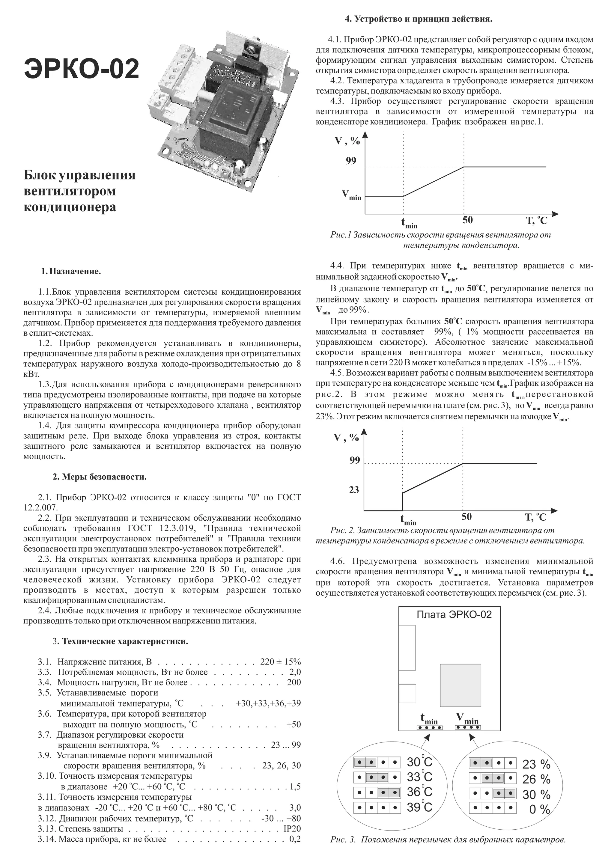 Блок управления вентилятором ERKO-02 предназначен для регулирования скорости вращения вентилятора в системе кондиционирования в зависимости от температуры. Прибор обеспечивает защиту компрессора и имеет различные рабочие режимы и параметры, включая минимальные и максимальные скорости вращения. Установка и обслуживание прибора требуют соблюдения технических и安全ностных мер.