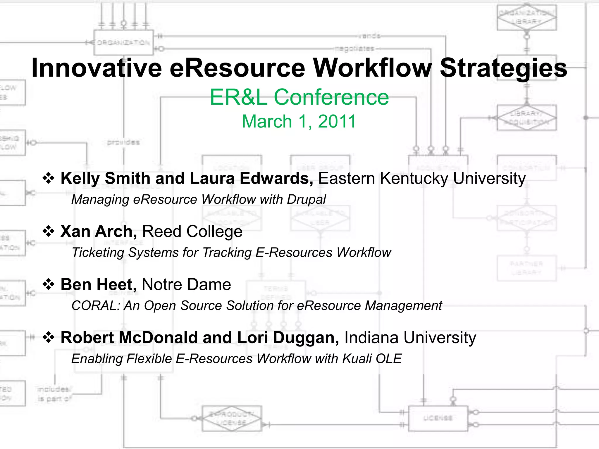 The document discusses innovative e-resource workflow strategies presented at the ER&L conference in 2011, focusing on various tools and systems for managing e-resources, including Drupal, Jira, and Kuali OLE. It highlights the importance of standardized processes and collaboration among library staff for effective tracking and management of electronic resources. Several presentations from different universities provide insights into their specific workflows and systems used to enhance efficiency and communication in e-resource management.