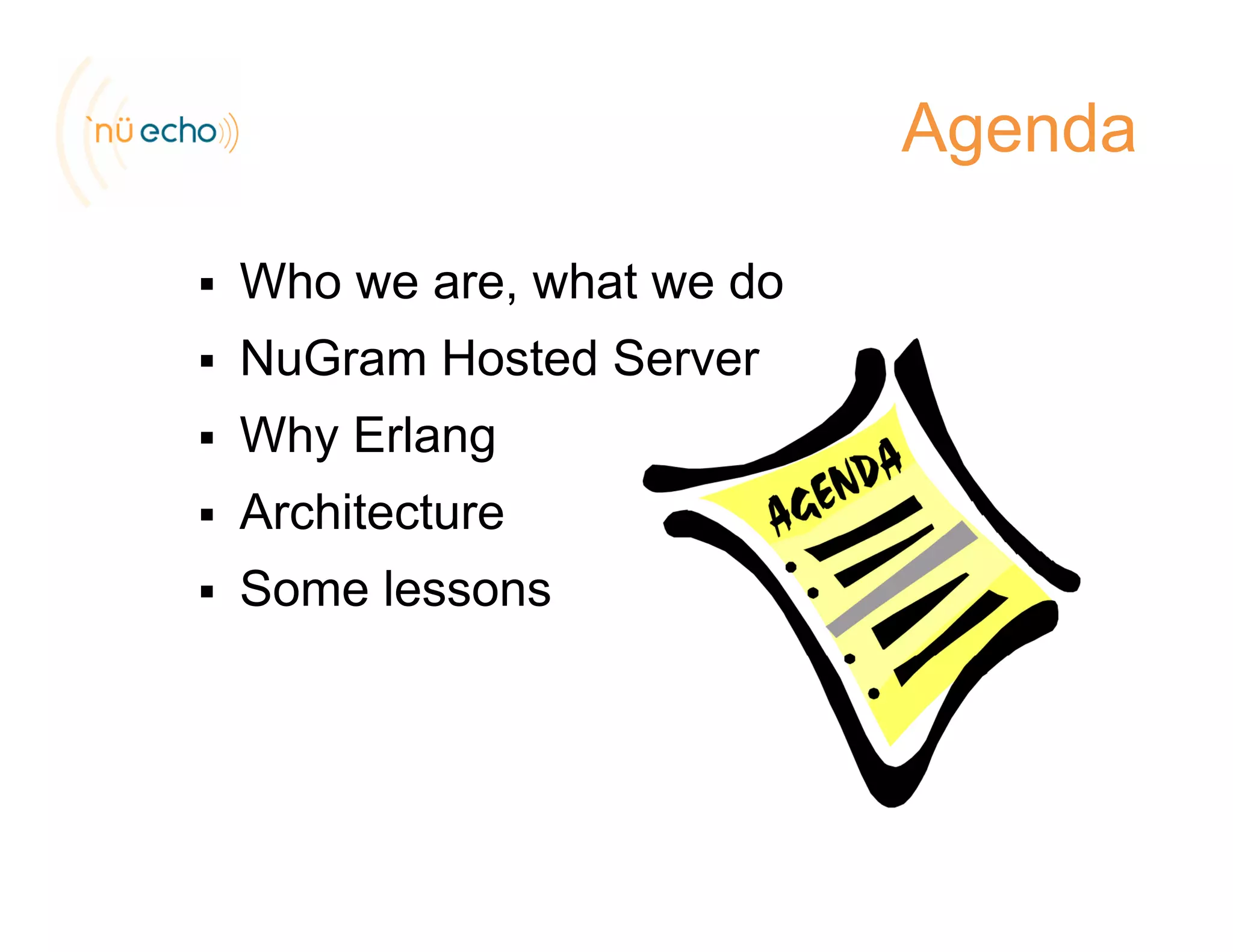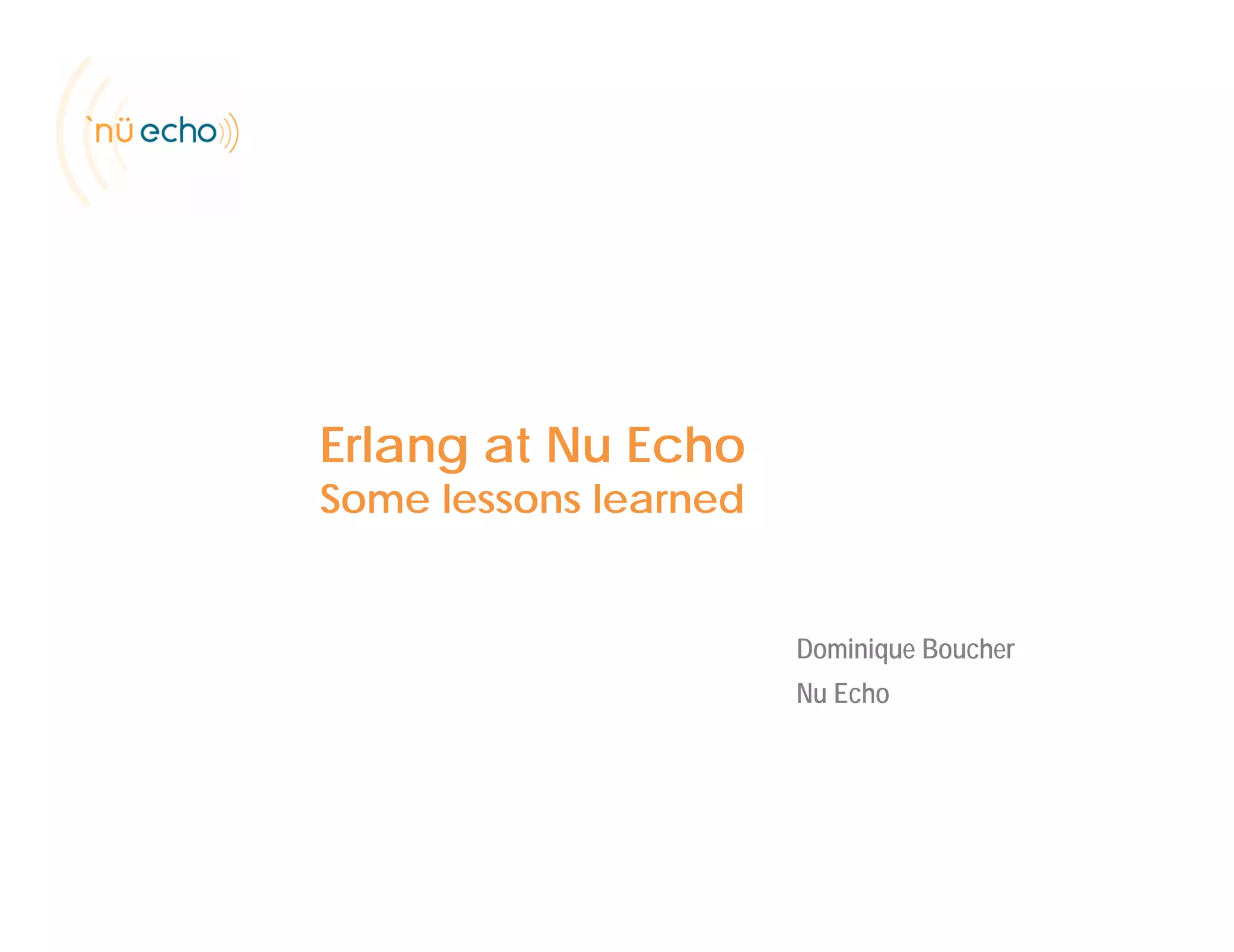 This document summarizes Nu Echo's experience using Erlang to build their hosted grammar server. It describes how they used Erlang and OTP principles to build a high-performance, fault-tolerant, and distributed system with components like Yaws HTTP server, Mnesia database, and Jinterface for Java integration. It also discusses lessons learned around Erlang's strengths in gluing systems together and handling protocols, and weaknesses in string manipulation. The document emphasizes learning and using OTP patterns from the start.