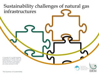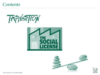 This document discusses sustainability in the business world. It provides an overview of ERM, a sustainability consulting firm, including their size, experience, and global presence. Several trends in sustainability are mentioned, such as the transition to lower carbon energy sources. Opportunities in renewable energy programs in Eastern Mediterranean regions are outlined. The concept of a "social license to operate" and managing stakeholder expectations are discussed. Financing strategies and an integrated approach to energy, efficiency, and emissions reduction are also covered. In conclusion, it is noted that the transition to new energy mixes is underway and will be influenced by megatrends and stakeholder engagement.