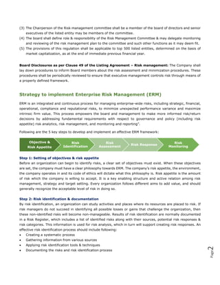 The document discusses enterprise risk management (ERM) as a systematic process aimed at minimizing risks to an organization's capital and earnings while ensuring compliance with legal and governance standards. It outlines the key compliance requirements set forth by the Companies Act 2013 and SEBI regulations for effective risk management and details the five key steps for implementing an ERM framework. Additionally, it compares two prominent ERM frameworks, COSO ERM 2017 and ISO 31000:2018, highlighting their unique principles and complementary aspects in organizational risk management.