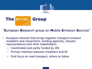 The ERMES Group coordinates research on mobile emission sources in Europe. It brings together transport emission modellers, researchers, funding agencies, and industry representatives. ERMES aims to become a permanent network that coordinates research programs to improve transport emission inventories in Europe. Key activities include harmonizing emission measurement procedures, sharing emission data, overseeing leading vehicle emission models like COPERT and HBEFA, and prioritizing future research issues.