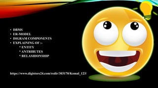 The document discusses the components of an entity-relationship (ER) model including entities, attributes, and relationships. It defines entities as objects, people, or places. Attributes describe an entity's properties. Relationships show how entities relate to each other, such as one-to-one, one-to-many, many-to-one, and many-to-many. The ER model develops a conceptual design for a database using these components depicted in an ER diagram.