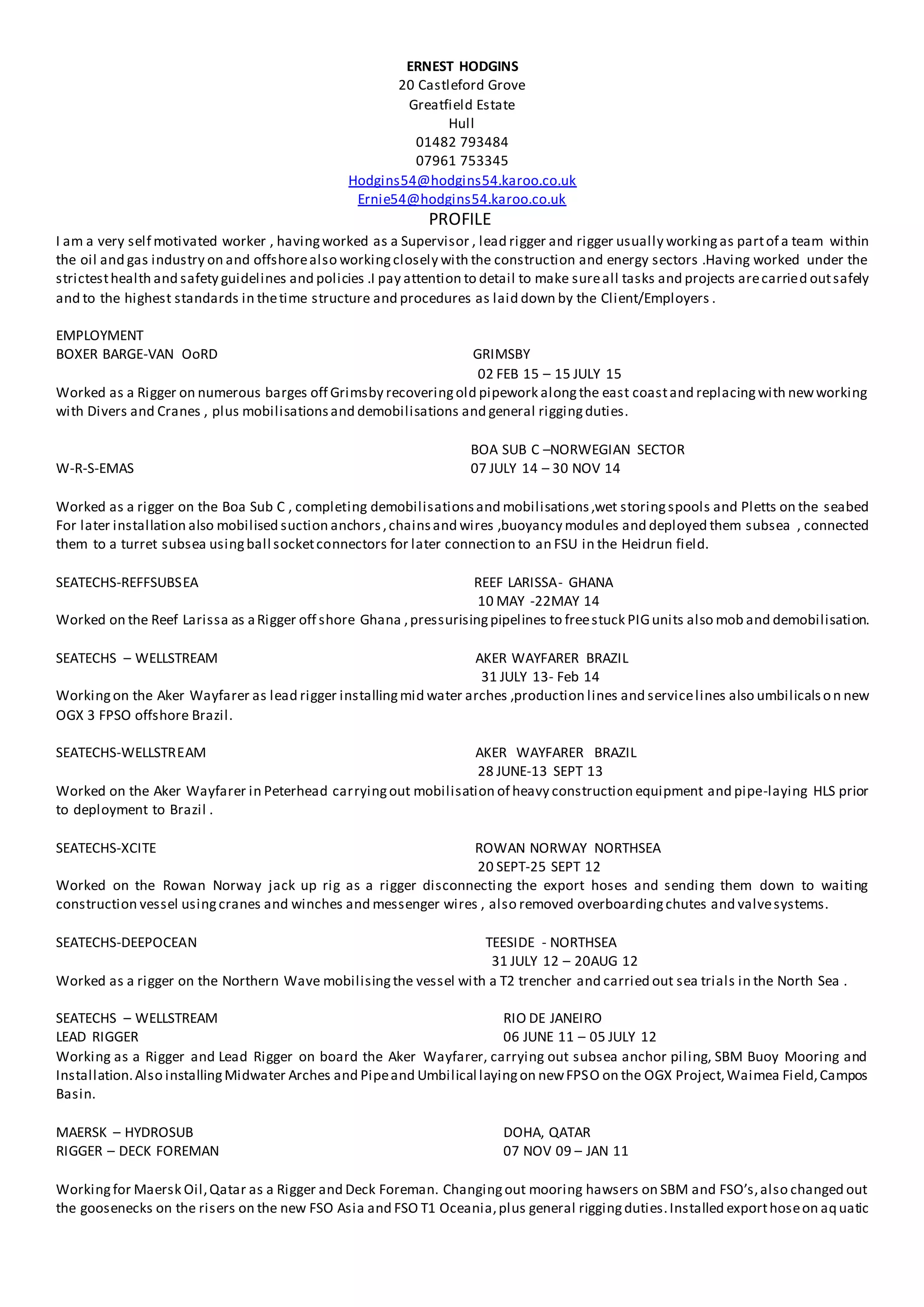 Ernest Hodgins has over 20 years of experience working in rigging roles within the oil and gas industry, both onshore and offshore. He has worked on numerous projects in locations such as the North Sea, Brazil, Ghana, and Qatar. Hodgins is skilled in tasks such as mobilizing and demobilizing equipment, installing and replacing pipelines and valves, and ensuring all work is performed safely and to a high standard. He has extensive safety and technical training qualifications.