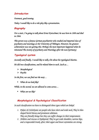 The document summarizes Ernst Kretschmer's typological system of classification. It discusses Kretschmer's background as a German psychiatrist who studied at the University of Tübingen. It then outlines Kretschmer's two-part typological classification system: 1) Morphological classification based on physical appearance, and 2) Psychological classification based on personality. The morphological types are pyknic, athletic, and leptosomic, each associated with distinct personality types. As an example, the document suggests Don Quixote would be leptosomic while Sancho Panza would be pyknic. It concludes by stating that each person has a unique personality.