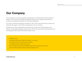 ero57 is a receivables management software created by MoretonSmith, a company with over 20 years of experience in receivables management. The software uses data analytics to help companies optimize their receivables processes, improve collections, and enhance customer communication. It provides customizable reporting, automated workflows, and user-friendly interfaces to help users improve key metrics like DSO and working capital. Customers in various industries have reported benefits like increased efficiency, improved visibility into performance, and tangible returns through implementation of ero57.