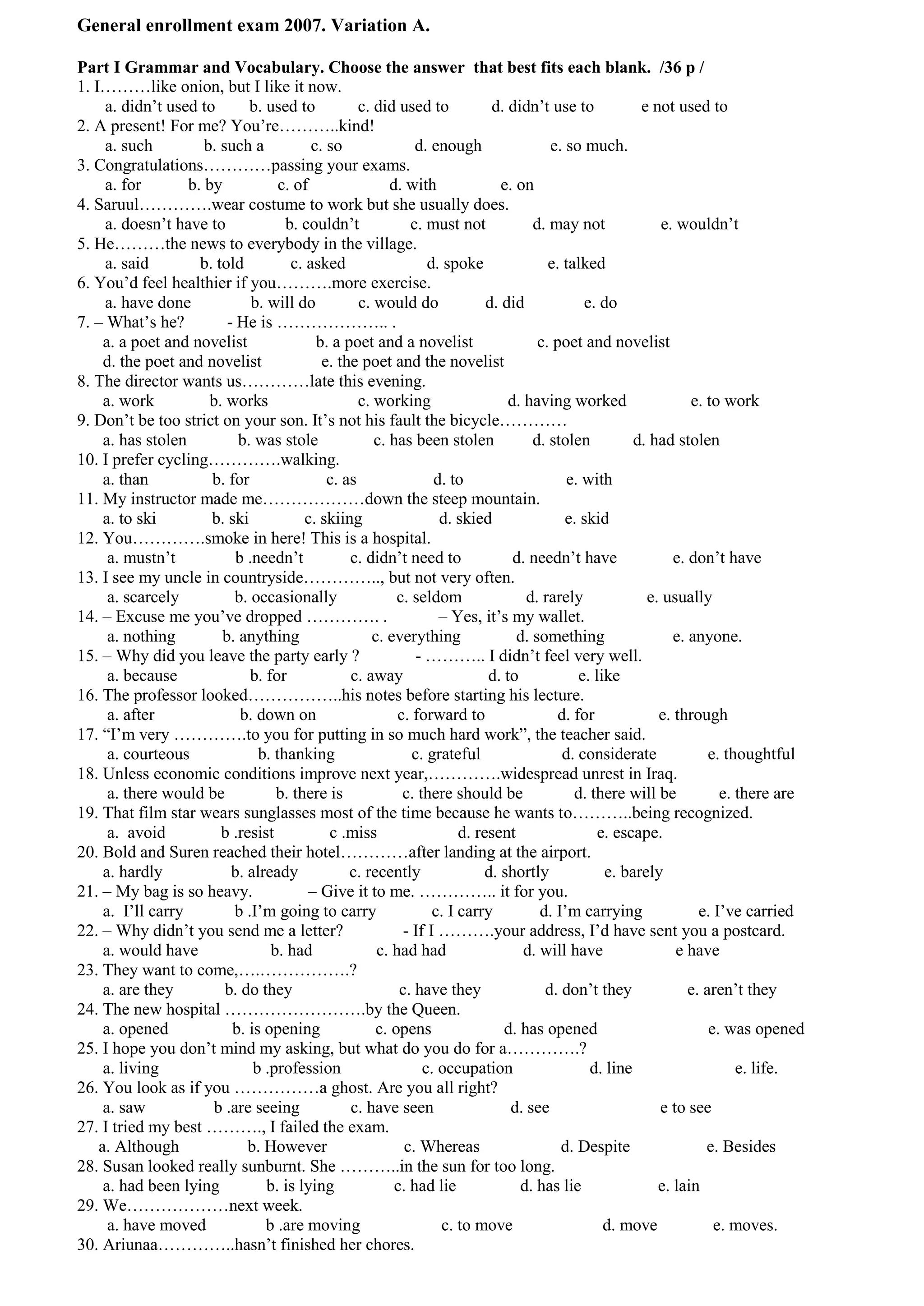 The document appears to be a passage from an exam on grammar and vocabulary. It contains 36 multiple choice questions testing understanding of parts of speech, verb tenses, prepositions, idioms and other grammatical concepts. The questions progress from simpler concepts like parts of speech to more complex ideas involving verb tenses and prepositional phrases. The passage provides context for applying grammatical rules but no direct answers to the questions.