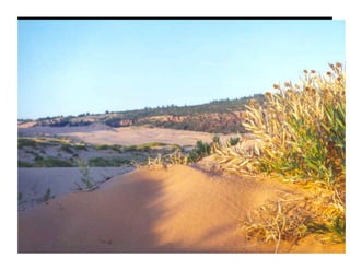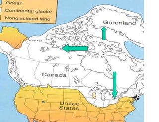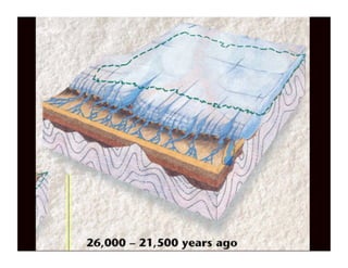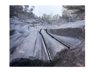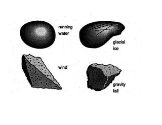 The document discusses different types of erosion caused by various agents. It describes how running water, wind, and glaciers each produce distinctive erosion features. It also explains the different ways sediments are transported by streams, including in solution, suspension, and being rolled along the stream bed. Glacial erosion leaves behind unsorted sediments and landforms like U-shaped valleys, striations, and kettle lakes.