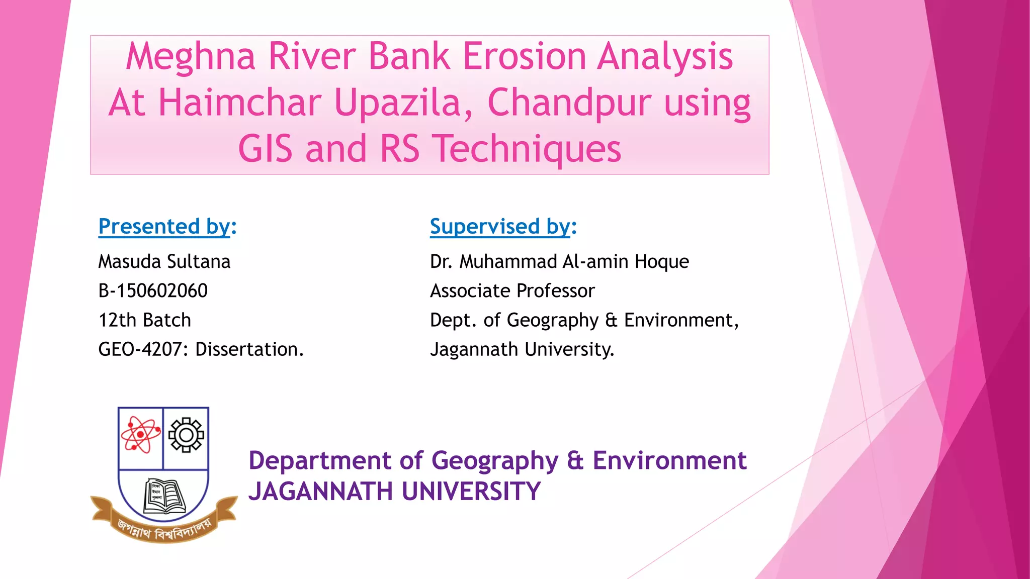 This document summarizes a student's dissertation on analyzing Meghna River bank erosion in Haimchar Upazila, Chandpur, Bangladesh using GIS and remote sensing techniques. The student discusses the background of river bank erosion in Bangladesh, states the problem and objectives of the study, which is to identify and assess Meghna River bank erosion and recommend mitigation measures. The methodology describes using satellite imagery from 1988 to 2021 to analyze erosion and accretion. Key findings show the highest erosion from 1988 to 2000, and highest accretion from 2000 to 2010, with the most stable river area from 2010 to 2021. Mitigation measures discussed include structural options like planting trees and constructing embankments, and non-structural like dredging and