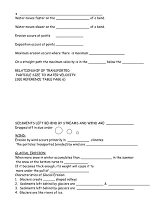 The document discusses different types of erosion and their effects on landscapes. It describes three main agents of erosion - water, wind, and glacial ice - and how each leaves distinct sediment patterns. Water erosion in streams is detailed, explaining how velocity, bends, and sediment size impact transportation and deposition. Glacial erosion is also outlined, noting how glaciers carve U-shaped valleys and deposit unsorted sediments.