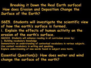 The document discusses weathering, erosion, and deposition, explaining how these natural processes shape the Earth's surface. It outlines various types of weathering, the agents of erosion (such as water and wind), and how human activities can influence these geological changes. Key concepts include the mechanisms of weathering, types of erosion, and different landforms created through these processes, alongside their impacts on the environment.