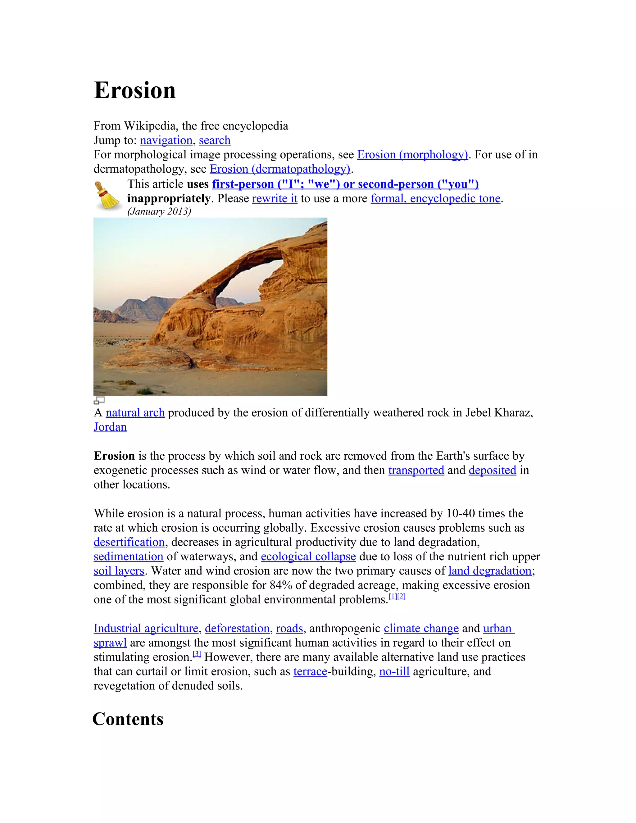 Erosion is the process by which soil and rock are removed from the Earth's surface by natural forces like wind and water. While erosion is natural, human activities have increased erosion rates globally by 10-40 times, causing problems like land degradation. The main types of erosion are water erosion from rainfall, rivers, coastal areas, glaciers and floods; wind erosion; and gravitational erosion.