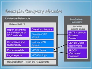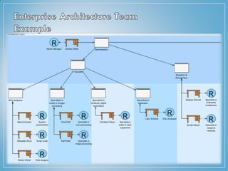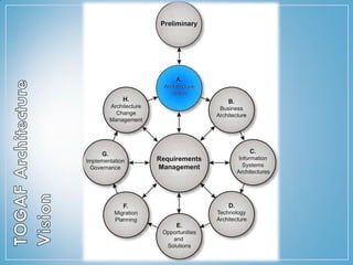 The document discusses the TOGAF architecture framework. TOGAF provides methods and tools to help establish, use, and maintain an enterprise architecture. It uses an iterative process model supported by best practices. The framework includes business, application, data, and technology architectures. It also describes the phases of an architecture development method including preliminary planning, developing the architecture vision, and building the business, application, data, and technology architectures.