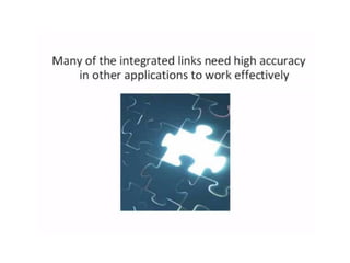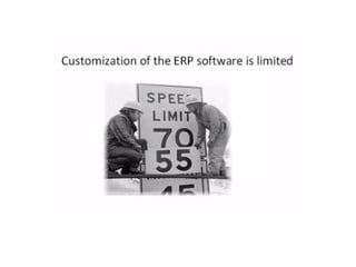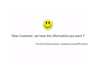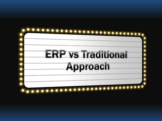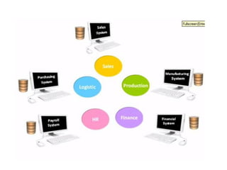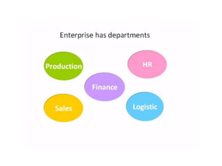 This document provides an overview of enterprise resource planning (ERP). It discusses what ERP is, the major players in the ERP market and their market shares, the functionalities of ERP systems, and future trends of ERP. ERP integrates business functions into a single system and replaces separate department systems. Major ERP vendors include SAP, Oracle, and Microsoft. Future directions of ERP include more innovative applications, targeting smaller businesses, and specialized areas like supply chain management.