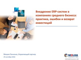 Документ рассматривает внедрение ERP-систем в средний бизнес, подчеркивая их важность для автоматизации бизнес-процессов и повышения эффективности. Упоминаются ключевые требования и специфика ERP-решений для малых и средних компаний, а также типичные ошибки и мифы, связанные с ними. Приводится информация о критерах успешности проектов и методах оценки возврата инвестиций.