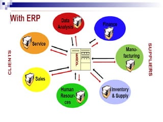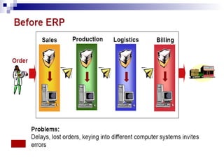 Enterprise resource planning (ERP) is a type of business management software that allows organizations to use a system of integrated applications to manage important business processes like manufacturing, supply chain, customer relationship management, and finance. ERP aims to integrate all departments and functions within a company onto a single computer system. This consolidation provides advantages like easy sharing of information between departments, automated workflows, reduced communication gaps, lower inventory costs and lead times, and standardized business processes. Major ERP software packages include SAP, Oracle PeopleSoft, and JD Edwards. SAP is one of the largest ERP providers and its various modules allow companies to effectively manage finances, materials, production, quality, maintenance and human resources.