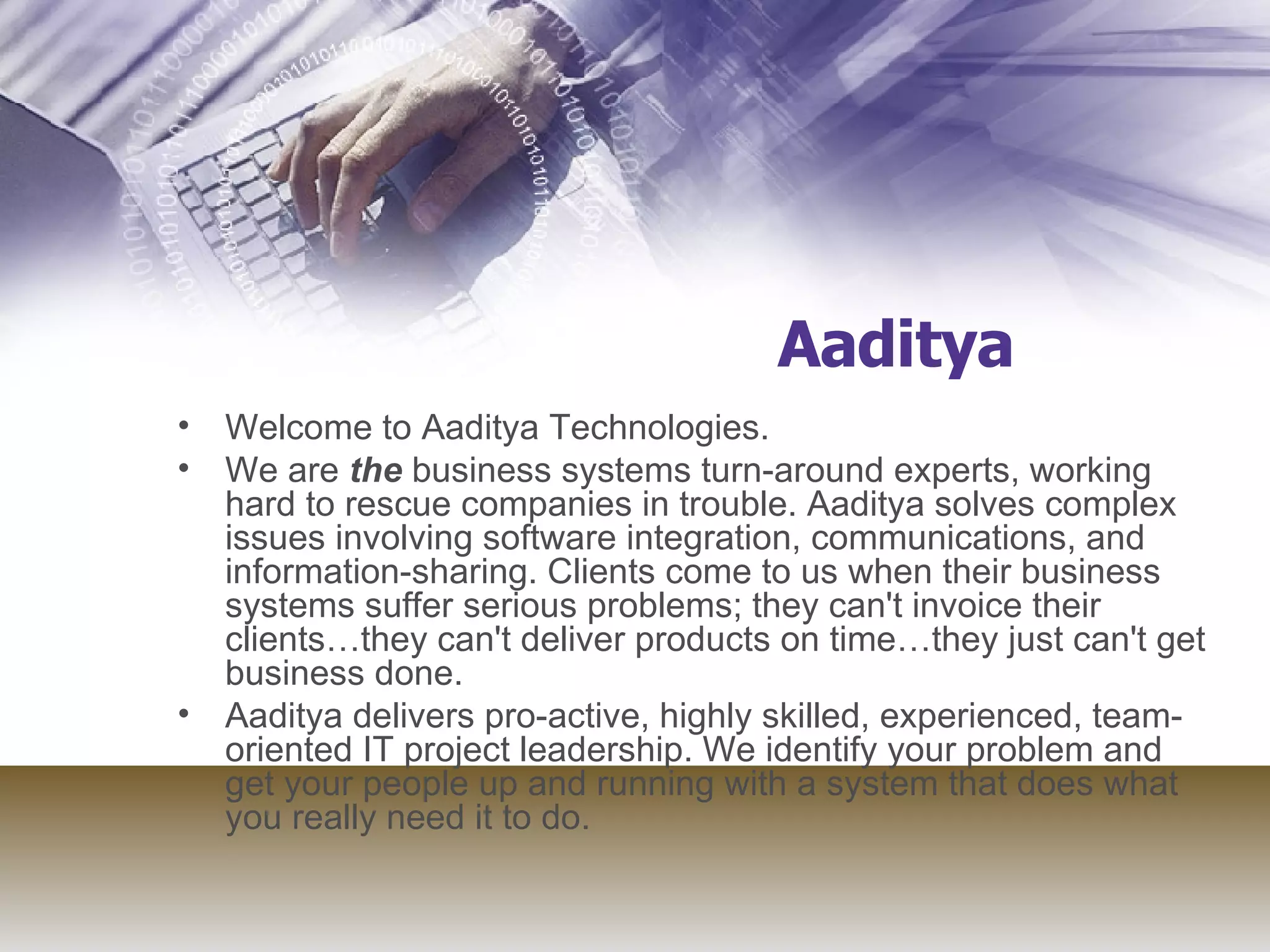 Aaditya Technologies specializes in rescuing troubled business systems through software integration and IT project leadership, focusing on delivering customized, scalable technology solutions. Established in 2001, the company has a team of experienced consultants and offers a range of services for ERP applications and e-commerce solutions, aiming to enhance efficiency and performance for clients across various industries. Their mission is to integrate business strategies with optimal technologies for a competitive advantage, ensuring quality and cost-effectiveness in project delivery.
