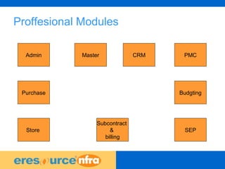 The document outlines the features and benefits of the eresource nfra ERP system, which tackles challenges in project management and customer relationship management. Key functionalities include project lifecycle management, procurement, billing, and customer service automation. It emphasizes the system's capacity for operational efficiency, improved visibility, and enhanced customer satisfaction, supported by a robust team and extensive experience in ERP implementation.