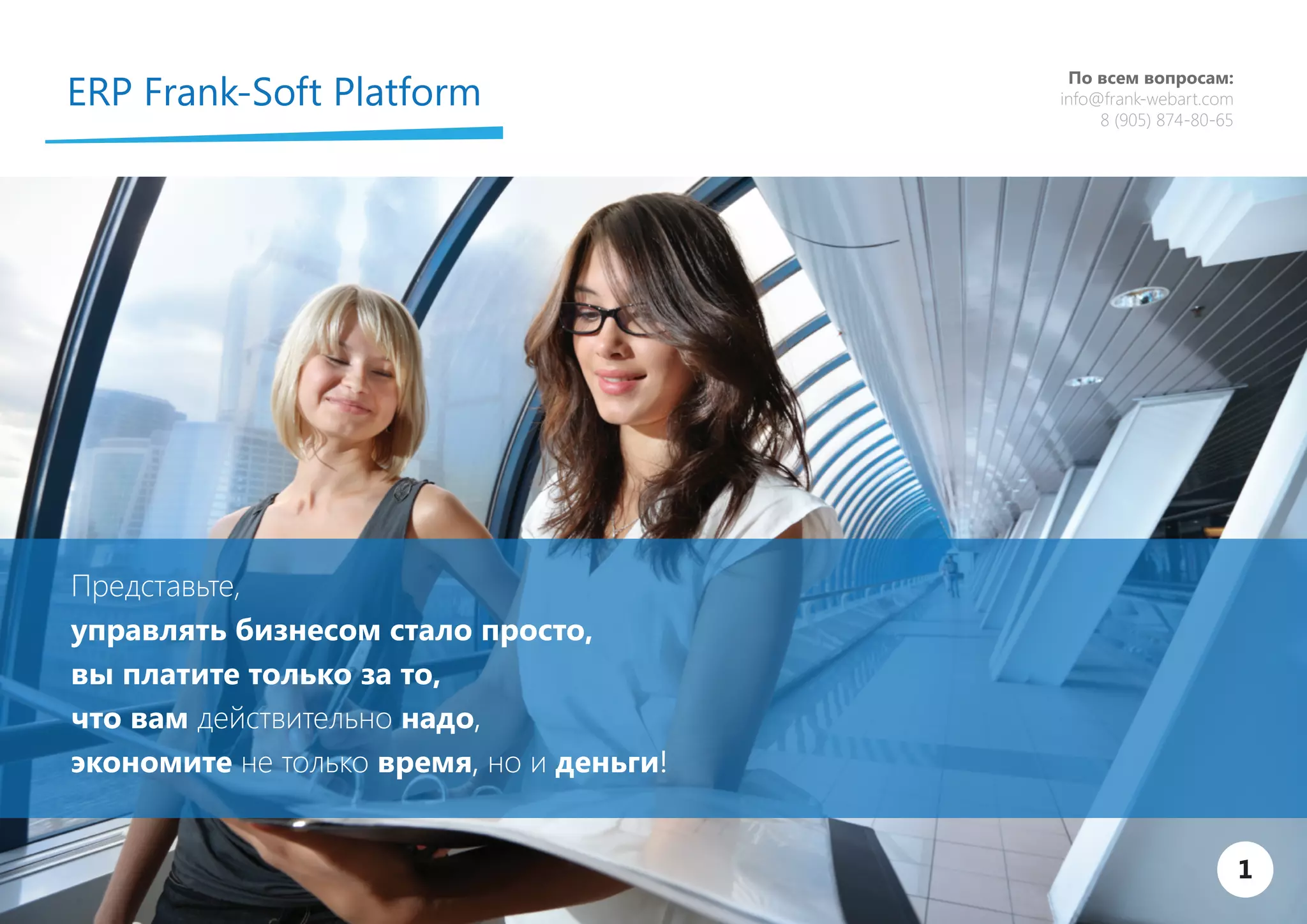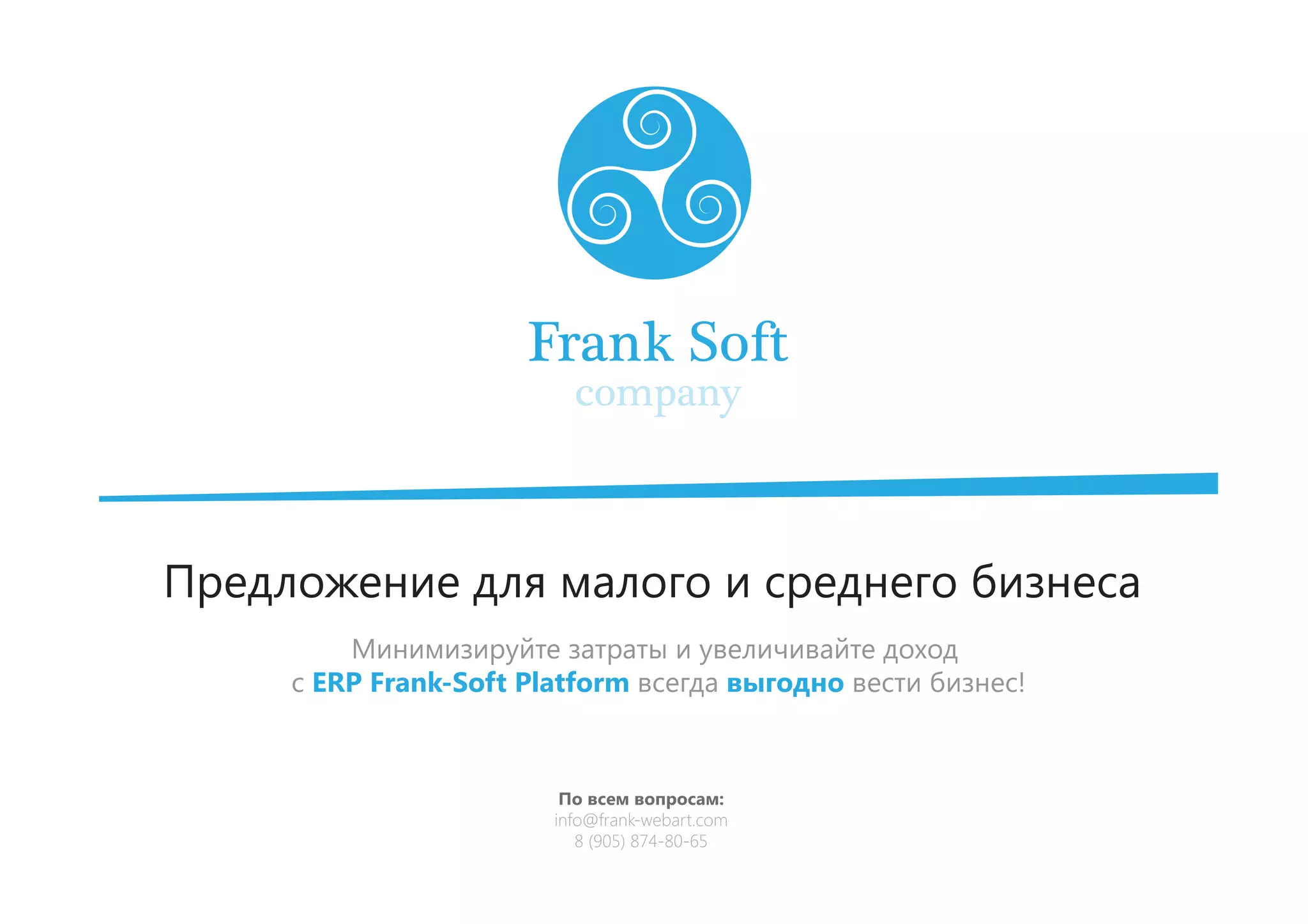 Документ представляет платформу ERP Frank-Soft, предназначенную для оптимизации бизнес-процессов в малом и среднем бизнесе через облачные технологии и минимизацию затрат. В нем подчеркнуты адаптивные возможности системы, простота управления и инструменты для повышения эффективности, такие как мобильные POS-терминалы и внутренние системы коммуникации. Упоминается опыт команды разработчиков и преимущества системы по сравнению с конкурентами на рынке.