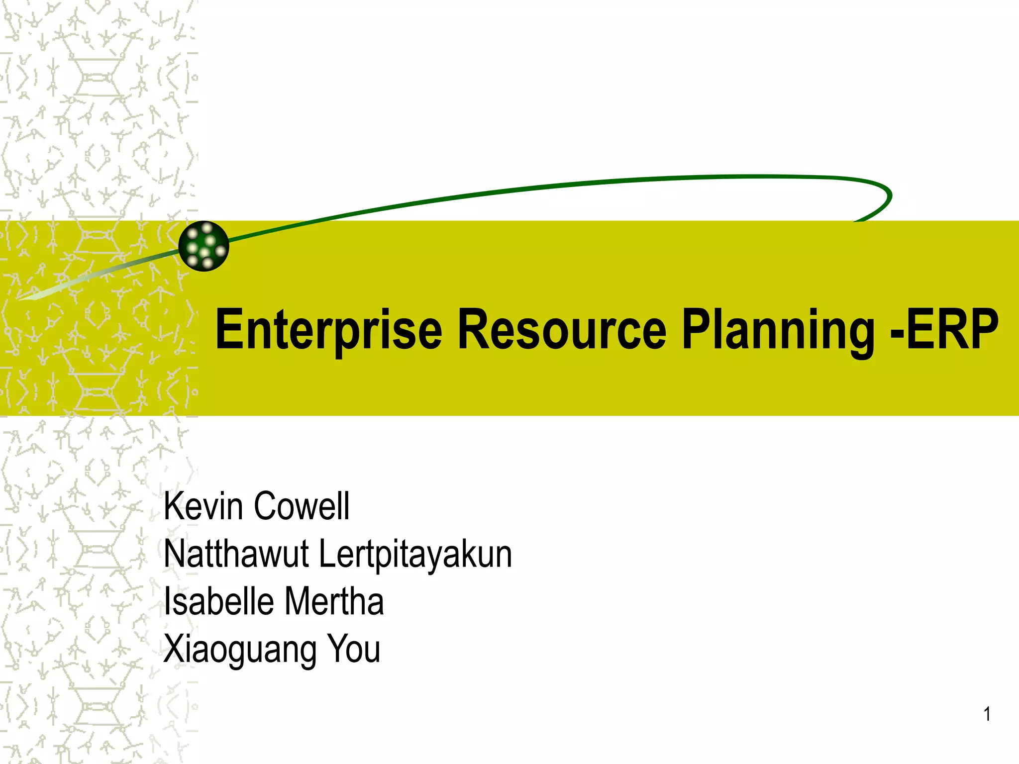 The document provides information about Enterprise Resource Planning (ERP) systems through several case studies. It begins with defining ERP and describing its components and evolution. It then discusses major ERP vendors and implementations at Nestle and Agilent Technologies. At Nestle, a large ERP project integrated systems and standardized processes, resulting in savings of $371 million by 2001. Agilent implemented ERP to help manage its global business across multiple divisions. The document outlines the benefits and risks of ERP systems as well as lessons learned from various implementation experiences.