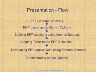 This document discusses various options for developing and implementing Enterprise Resource Planning (ERP) systems. It describes building ERP solutions using internal resources, adapting tailor-made ERP solutions, and developing ERP applications using external sources. For each option, it outlines the key steps, considerations, potential pitfalls, and critical success factors. The document provides an overview of ERP concepts and aims to help organizations evaluate which approach may best suit their needs and resources.