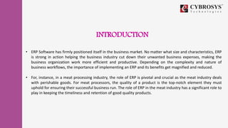 The document discusses the significance of ERP software in the meat processing industry, emphasizing its role in improving efficiency, reducing waste, and maintaining product quality. It highlights features such as advanced traceability, automation of goods movement, and streamlined recall management as essential for compliance with safety regulations. Overall, the implementation of ERP systems provides numerous benefits including cost reduction, enhanced supply chain management, and improved customer satisfaction through timely deliveries.