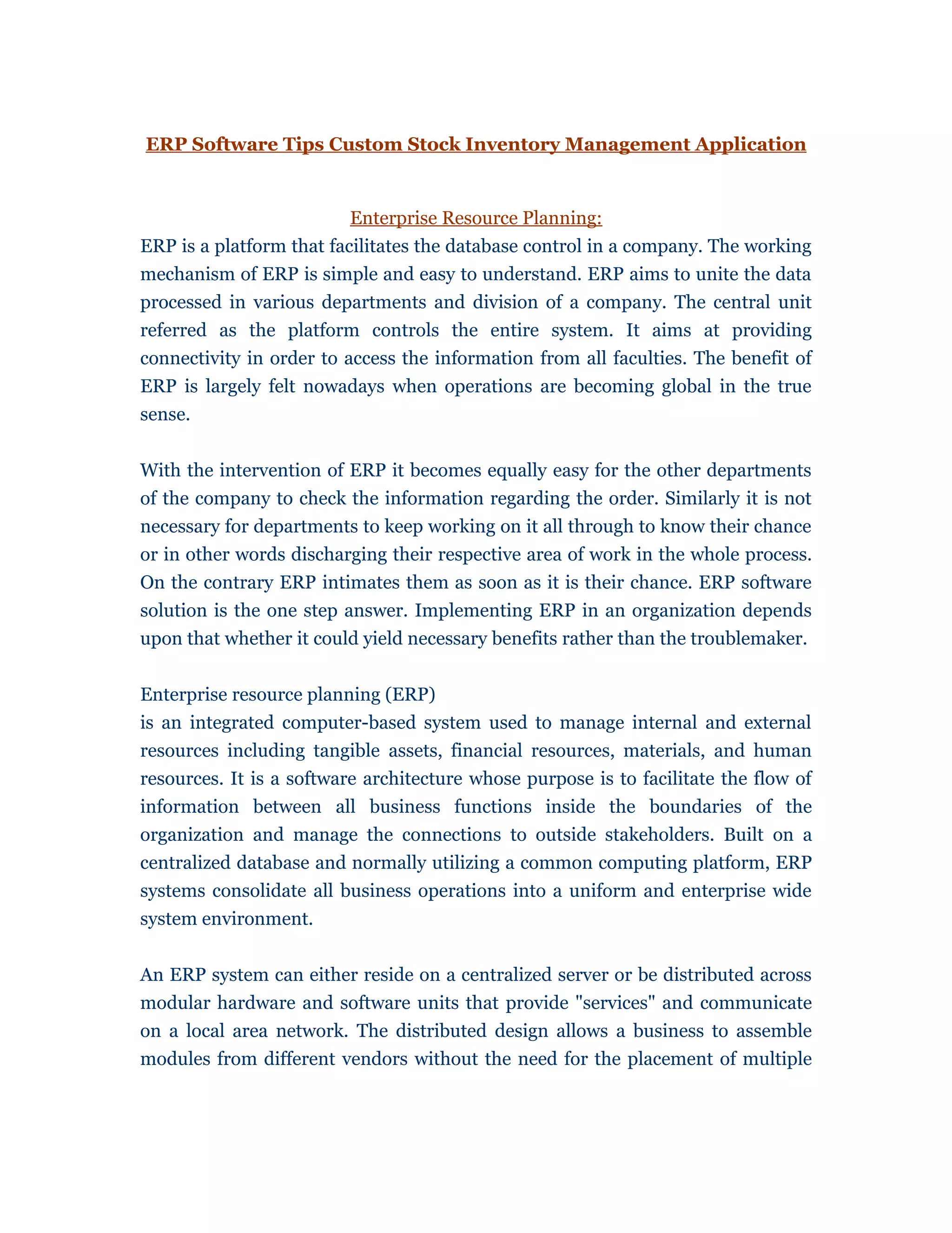 Enterprise resource planning (ERP) software integrates internal and external management of resources across an entire organization. ERP aims to integrate all data and processes of a company into a single system. It benefits organizations by streamlining processes, improving communication and access to real-time information across departments. While ERP implementation requires significant costs and process changes, it provides increased efficiency and control when successfully adopted.
