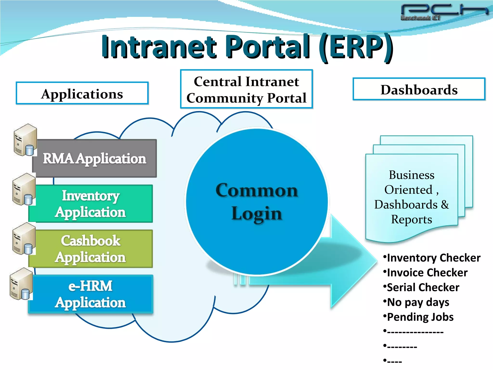 The document outlines the objectives and modules of an ERP system for a company. The key objectives are to develop custom support applications, match practical scenarios, and apply international standards using open source technologies. The main modules include an intranet portal, inventory, cash book, customer service, transport management, assets management, internal maintenance, and HR management. The HR module covers employee profiles, performance management, training, and recruitment functions.