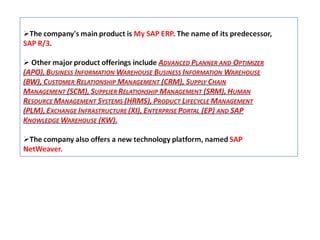 The document discusses Enterprise Resource Planning (ERP) systems and their implementation. It provides an overview of major ERP software vendors like SAP, Oracle, and PeopleSoft. It then focuses on SAP, describing it as the market leader and largest ERP software company. Key details about SAP's history, products, and architecture are summarized. The document concludes by discussing common pitfalls in ERP implementations and emphasizing the importance of requirements in determining project success or failure.