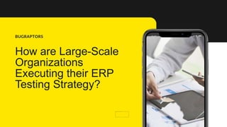 This document discusses how large organizations can effectively test their ERP implementations. It recommends planning testing requirements collection, selecting appropriate test types like functional, security and integration testing, hiring a qualified QA team familiar with the ERP modules, eliminating defects through testing and creating test reports, and ensuring business excellence through quality ERP testing. The document promotes the services of BugRaptors, an ERP testing company that can help organizations meet business challenges and ensure their applications meet ERP standards.