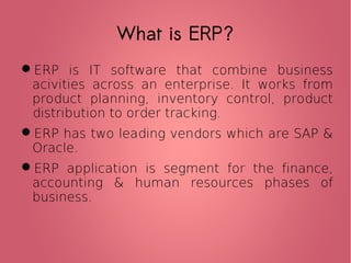 The document outlines the typical phases of an ERP implementation lifecycle. It discusses pre-evaluation screening to select an appropriate ERP package, package evaluation, project planning, gap analysis between current and needed processes, reengineering current processes, system configuration, training the implementation team and end users, testing, going live with the new system, and post-implementation maintenance. Successful ERP implementation requires addressing all of these phases to ensure a smooth transition.