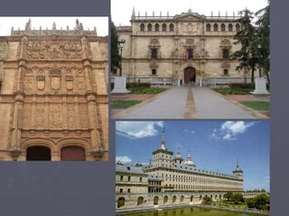 Berpizkundeko arkitektura Geografia:Espainia Espainian, Berpizkundea forma gotikoekin nahasia agertu zen XV.mendeko azken hamarkadetan eta XVI.aren lehen herena: Estilo berriak Plateresko izena du, fatxada oso dekoratuak dituelako, zilarginen lana gogoratzen duelako, adibidea dugu Salamancako Unibertsitateko fatxada . Orden klasikoak eta kandelabroen motiboak ( candelieri ) libreki konbinatzen dira forma geometrikoak eratuz. XVI.mendearen bigarren herena: Purismoa nagusitzen da arkitekturaz; Gil de Hontañon eta Covarrubias arkitekto ezagunekin; adibidez Alcalako ibertsitatea XVI.mendearen azken herena: Pedro Machuca, Juan Bautista de Toledo eta Juan de Herrera arkitektoekin Erromako ereduarekiko lotura handiagoa dago, batzuetan Manierismoa edo Herreriarra aurreratuz, adibideak dira Granadako Karlos V. aren jauregia eta Escorial .