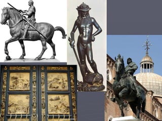 Berpizkundeko eskultura Zaldigaineko eskulturaren berreskurapena Pertsonai bat zaldi gainean tamaina errealean eskultoreentzako gai erakargarria zen baina ez zen posible izan hasiera batean, egiteko kostea oso altua zelako eta batez ere arazo teknikoak zeudelako brontzea urtzeko. Monumentu hauek erabiltzen ziren gizonezko famatuen bertute hiritar eta sekularrak azpimarratzeko eta Marco Aurelioren eredua jarraitu zuten. Hasieran beste ereduak irauten ez zuten materialetan egin ziren. Adibiderik onenak dira Condottiero Gattamelata Donatellok egina, eta Condottiero Colleoni, Verrochiok egina.