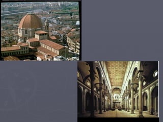 Berpizkundeko arkitektura Cuattrocento: Brunelleschi Bere elementu esanguratsuena ordena da. Erromako aztarnen artean agertu ziren eraikuntzetan orden matematiko sinple bat zegoela ikusi zuen. Bazegoen norma bat Erromatar arkitekturan —arku semizirkular baten zabalera bere altuerako bikoitza da. Erromatar arkitekturako ikerketa honetatik simetria eta proportzioarekiko zaletasuna etorri zen eta eraikuntzak kontuan hartzen dira bere osotasunean beste detaileak haien arteko eraginak izaten. Lanak: Florenziako Katedraleko kupula, Hospital degli Innocenti, San Lorenzo