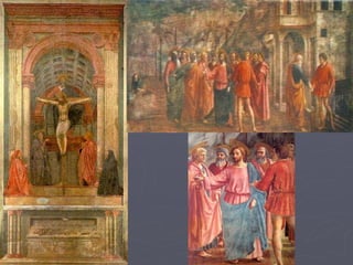 Berpizkundeko pintoreak Pierodella Francesca Perspektiba eta geometria bere lanetan nagusitzen dira Koloreko masa handian antolatzen zituen eta hauekin azpimarratzen zuen eskema geometriko bat Paleta argia Zona handiak zuriz edo ia zuriz margotuak Lanak: Kristoren Bataioa, Jaiotza .