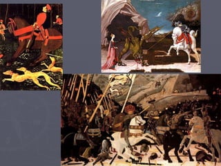 Berpizkundeko pintoreak Ucello:Bere obrek Erdi Aroko garaia gogoratzen dute Perspektibarekiko interesa Irudiak solidoak eta errealak dira Ez zekien nola erabili argia eta itzala Geometria aplikatuarekiko kezka Lana: San Romano-ko bataila