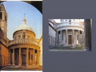 Berpizkundeko arkitektura Goi-Berpizkundea: Bramante Erroman Bramantek “forma arkitektoniko perfekto” bezala ezagutzen dena sortuzuen, San Pietro in Montorio -ko klaustroan egindako Tenpletea . Tenplu zirkular txiki hau San Pedro martirizatua izan zen tokian eraiki zen. Vestaren tenplu -ko aztarnetan oinarritua dago, Erromako sakratuena. Kontrastea sortzen du honen inguruan dagoen klaustroarekin. Bramantek Vaticano -n egin zuen lan eta bere proiektua aukeratua izan zen San Pedroren Basilika eraikitzeko. Lanak: San Pietro in Montorio, Santa Maria delle Grazie