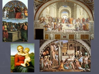 Berpizkundeko pintoreak RafaelKonposaketako antolakuntza garbia Gehiegizko detailearen abundantzia Konposaketako estilo espansiboa, irudiak osotasun bat bezala egiten dituela eta ulertzeko errazak Pintura ez zen gertakari baten kopia baizik eta gertakari horren interpretazio subjektibo bat Leonardo eta Michelangeloren berrikuntzak erabili zituen Lanak: Atenaseko Eskola, Madonna Sixtina, Birjinaren ezkontzak.