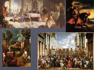 Berpizkundeko pintoreak Giorgione:Irudiak detailerik gabe egiten zituen Paisaia ondoa baino gehiago da Lana: Tenpestatea Tintoretto: Erotismo hotza gai mitologikoekin lotuta. Pintura erlijiosoa kolore eta perspektibaz beteta Lana: Oinen garbiketa Titian Historiako pintura Poza handiko erretratuak Lanak: Karlos V Mülbherg-en, Bakanal Veronese Bolumen erregularrak Kolore gogorrak eta kontraste handiak Irudi konbentzionalak Lana: Canaa-ko ezkontzak