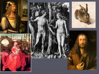 Berpizkundeko pintoreak DürerIparraldeko Berpizkundeko artistarik garrantzitsuena Auto-erretratuak egin zituen lehen artista Grabatzailea izan zen ere Erretaula onen eta erretratu boteretsuen autorea Gaien barietatea bere akuareletan Lanak: Adan eta Eba, Auto-Erretratua