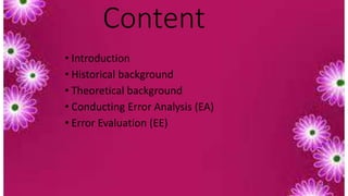 This document provides a summary of error analysis and its historical background. It discusses how error analysis evolved from contrastive analysis in the 1960s. Contrastive analysis predicted errors based on differences between a learner's native language and the target language but did not accurately predict all errors. Error analysis emerged in the 1970s as a superior alternative that studied all types of learner errors without relying solely on native language influences. The document outlines the typical steps in conducting an error analysis, including collecting language samples, identifying errors, describing errors, and explaining error sources. It also discusses theoretical perspectives like interlanguage theory and different types of errors learners may make. Finally, it notes that error evaluation was a supplementary step to determine which errors required instruction but