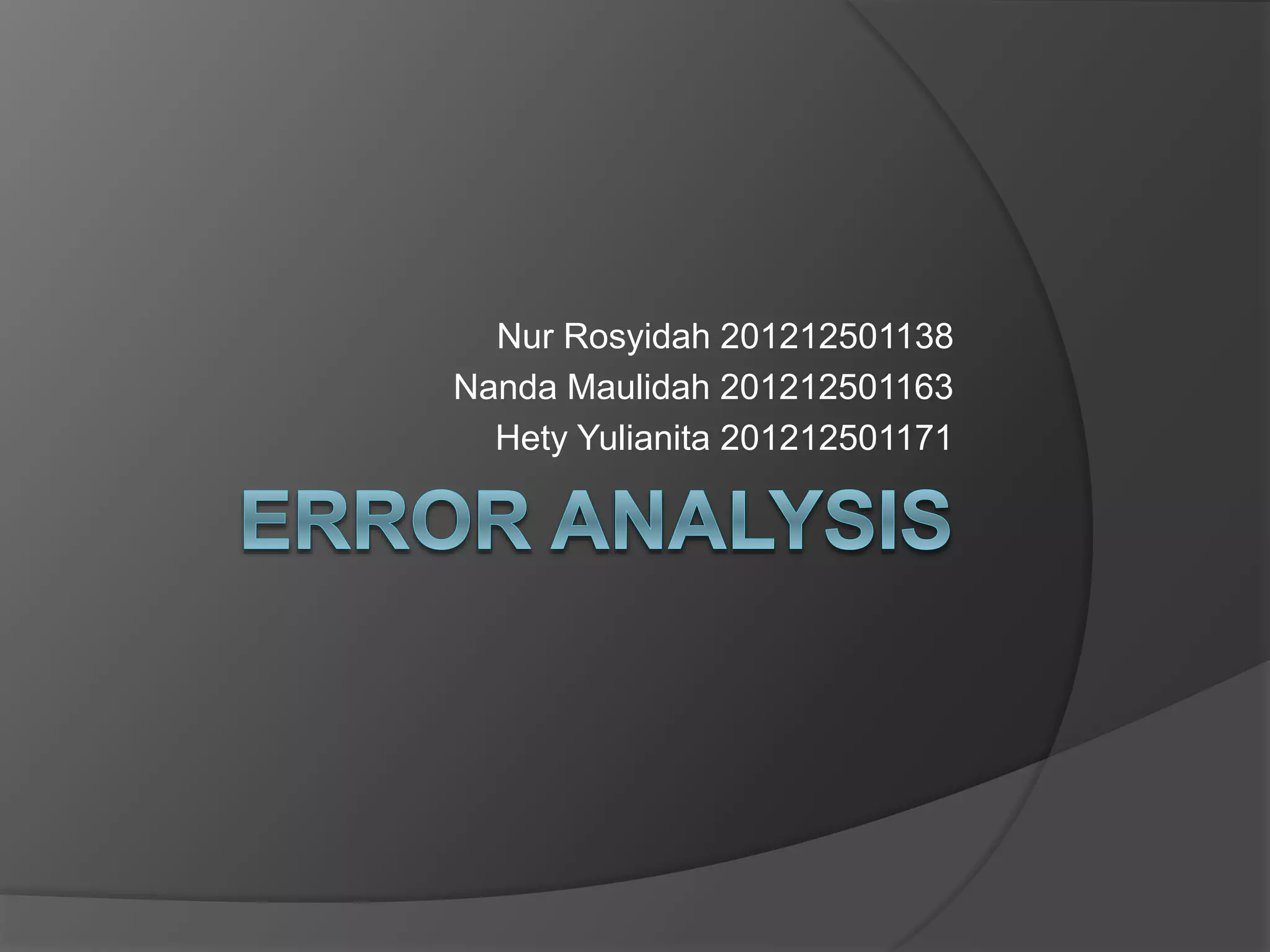 The document discusses error analysis in second language acquisition. It begins by stating that making errors is natural and inevitable in language learning. It then defines error analysis as the systematic study of deviations from target language norms during second language acquisition. The history of error analysis is discussed, noting that it was established in the 1960s as an alternative to contrastive analysis. Error analysis showed that contrastive analysis could not predict most learner errors. The document also discusses different ways of classifying errors and some methodological problems with error analysis approaches. It concludes by distinguishing between errors, mistakes, and lapses in learner language.