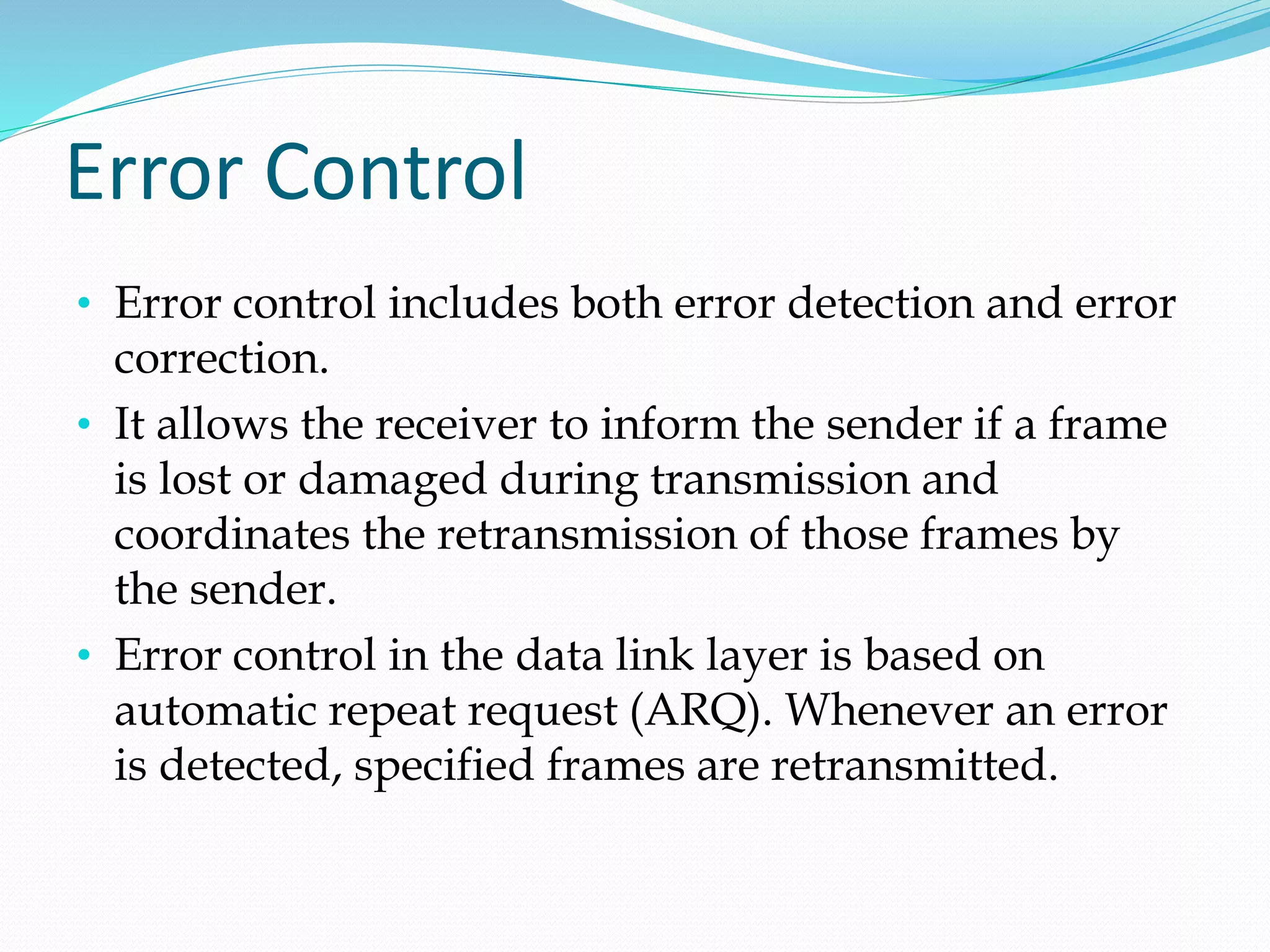 Error control techniques allow for detection and correction of errors during data transmission. Error control is implemented at the data link layer using automatic repeat request (ARQ) protocols like stop-and-wait and sliding window. Stop-and-wait involves transmitting a single frame and waiting for an acknowledgment before sending the next frame. Sliding window protocols allow multiple unacknowledged frames to be transmitted by using frame numbers and acknowledging receipt of frames. These protocols detect errors when frames are received out of sequence and trigger retransmission of lost frames.