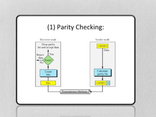 The document discusses error control in network layers, focusing on two types of transmission errors: single bit errors and burst errors. It describes various error control techniques such as parity checking, cyclic redundancy check (CRC), and checksums, outlining how they ensure accurate data transmission. The document also explains the processes involved in these techniques, including the use of redundancy bits to detect and correct errors.