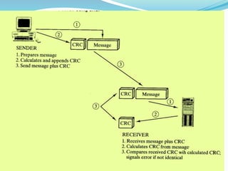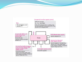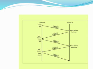 The document discusses error control in TCP networks. It describes tools like acknowledgements and timeouts that TCP uses to detect errors in transmitted data and request retransmissions. It also covers error detection techniques like cyclic redundancy checksums and different ARQ protocols including stop-and-wait, go-back-N, and selective repeat which use acknowledgements and negative acknowledgements to ensure reliable data transmission.