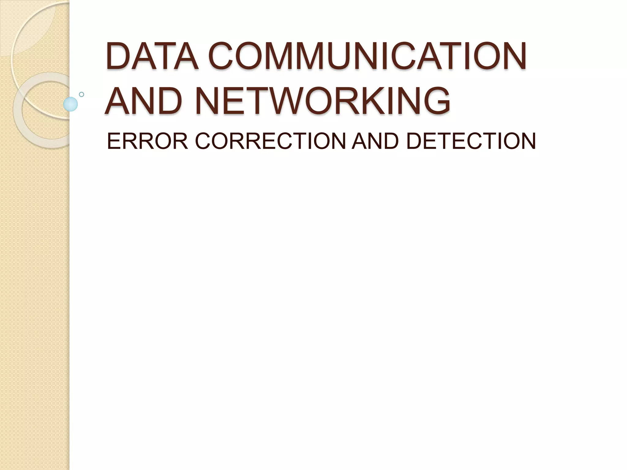 This document discusses error detection and correction techniques used in data communication networks. It describes common types of transmission errors like single bit errors and burst errors. It then explains different error detection methods including parity checking, longitudinal redundancy checking (LRC), and checksum checking. It also covers error correction techniques like Go-Back-N and Selective Repeat that allow retransmission of only corrupted frames. Flow control mechanisms like stop-and-wait and sliding window protocols are also summarized.