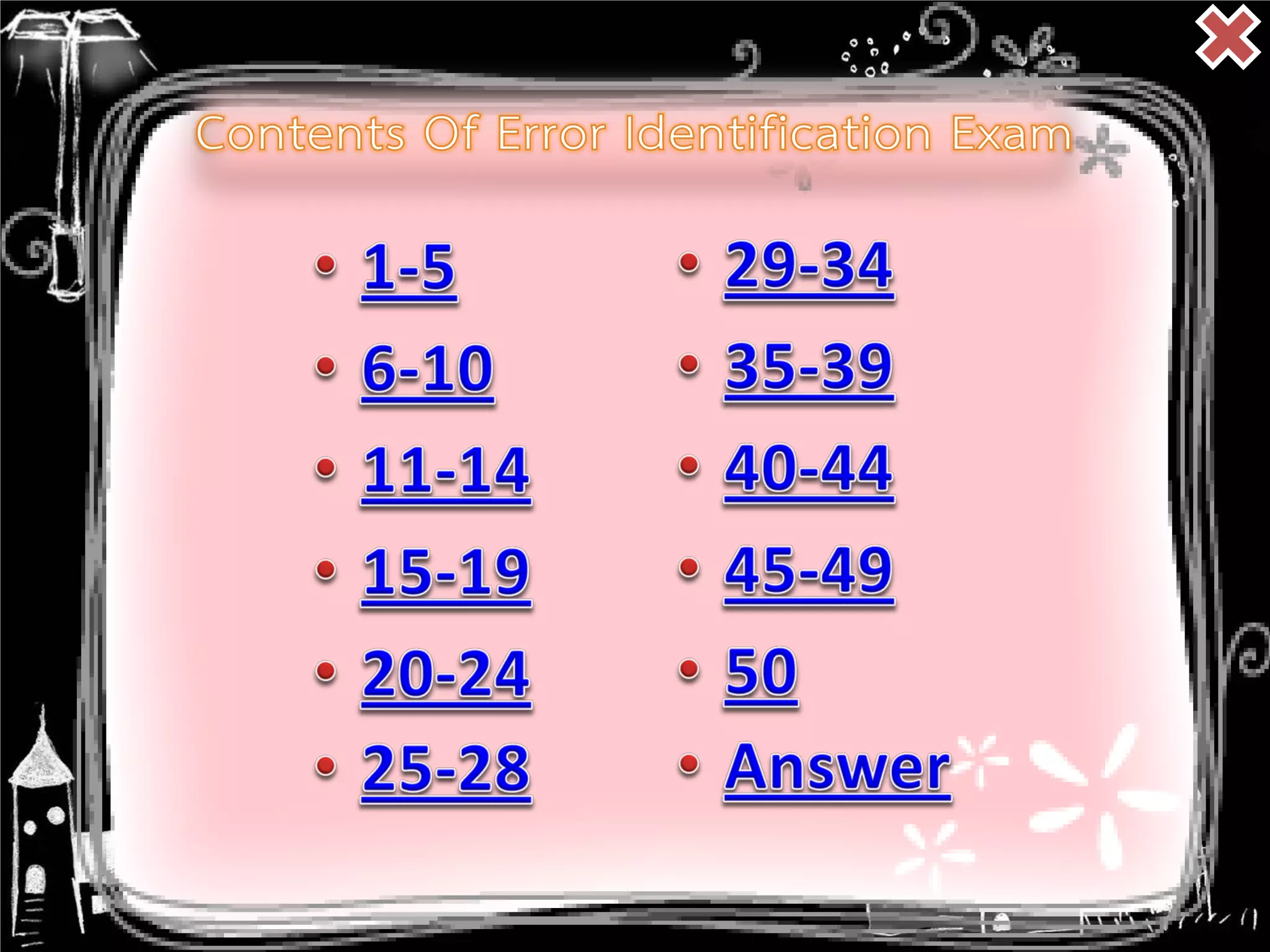 The document appears to be a list of English errors identified in various sentences. It includes 50 sentences with errors in areas like grammar, punctuation, word choice and syntax. For each sentence, the corresponding line number and the identified error are provided. The purpose seems to be helping students learn to identify different types of common errors in English.