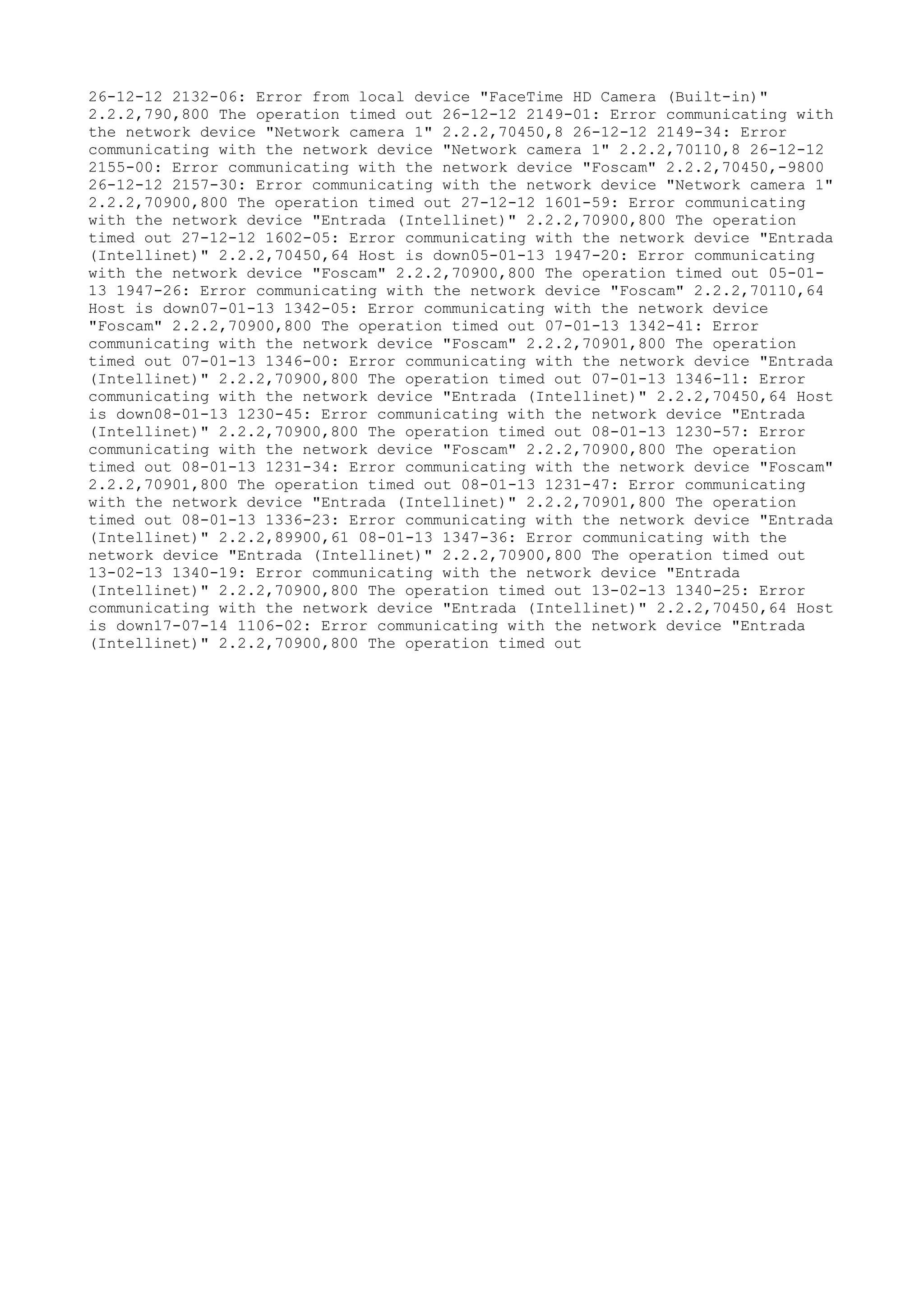 The document contains a log of error messages from various network devices, including cameras and a local FaceTime camera, over an extended period of time. The errors include issues with communication timeouts and hosts being reported as down. Multiple devices such as Network Camera 1, Foscam cameras, and an Entrada camera experienced recurring errors communicating with the network on different dates.