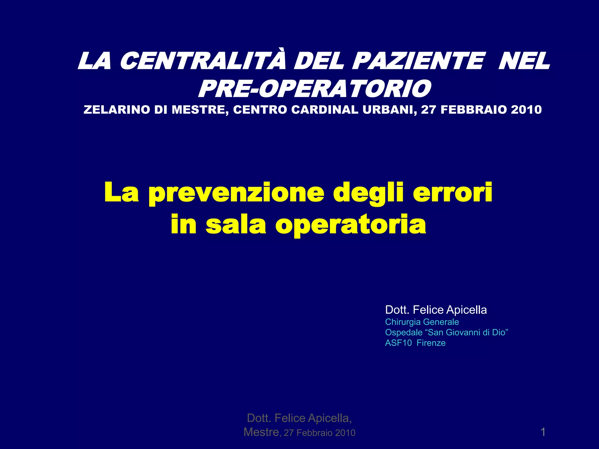 Il documento discute la prevenzione degli errori in sala operatoria, evidenziando gli eventi avversi e gli eventi sentinella che possono danneggiare i pazienti. Viene sottolineata l'importanza dell'implementazione di checklist per migliorare la sicurezza del paziente e ridurre le complicanze post-operatorie. Inoltre, si elencano gli obiettivi per garantire la sicurezza in sala operatoria e si forniscono dati sull'incidenza degli eventi avversi.